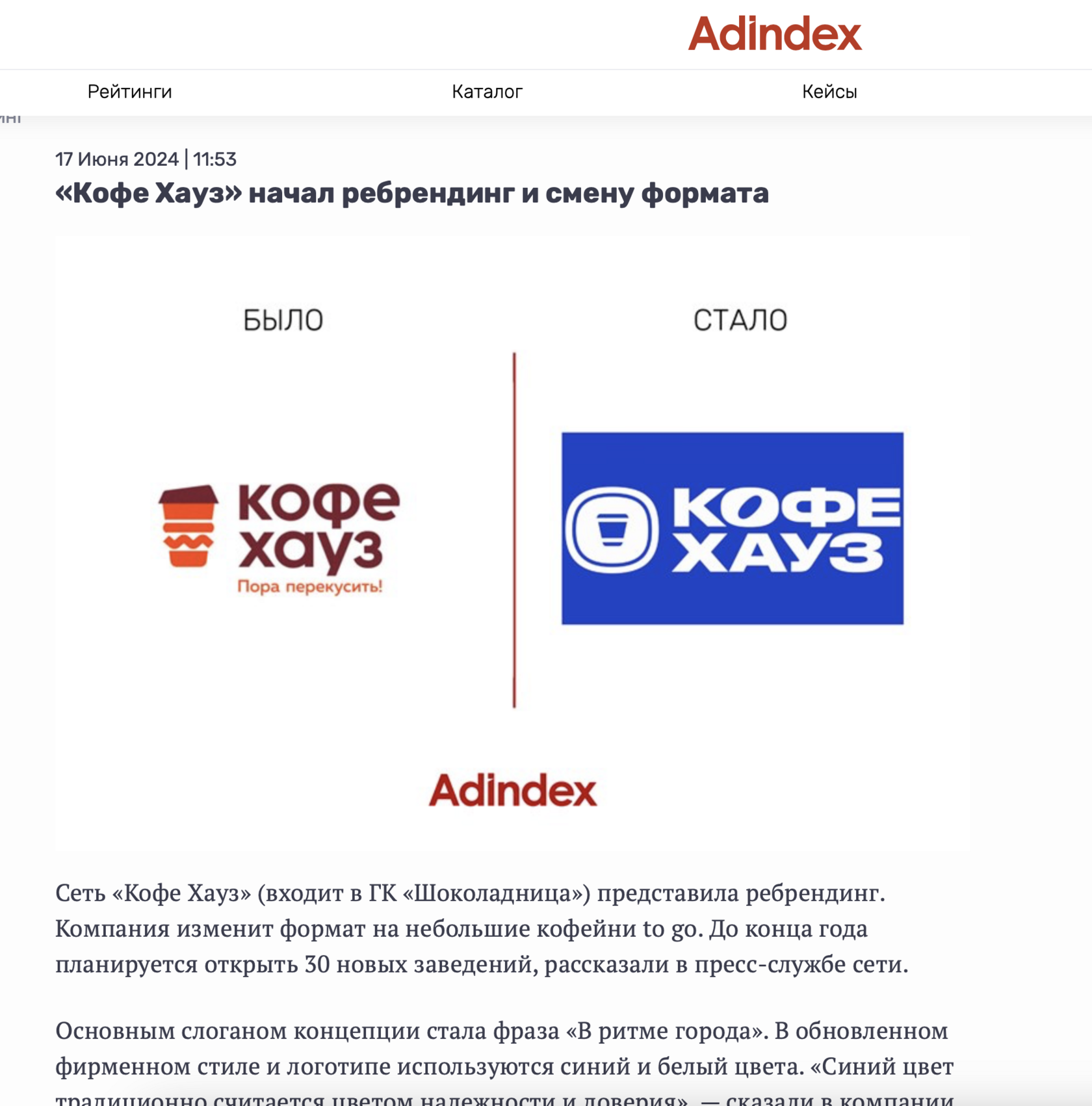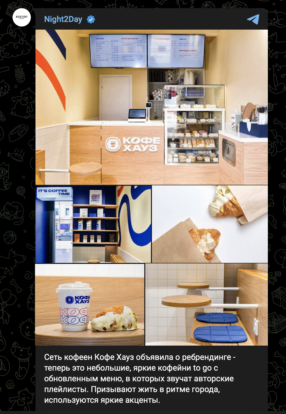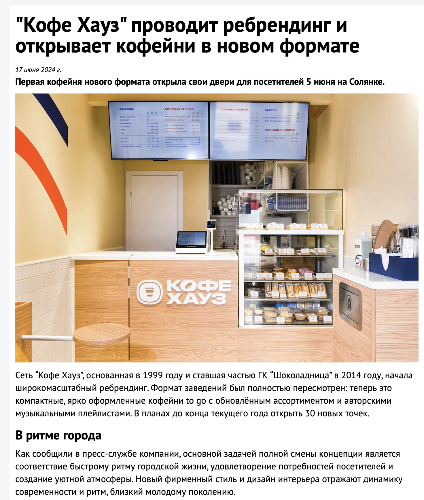Клиент: Российская сеть кофеен «Кофе Хауз» создана в 1999 году и с 2014 года входит в ГК «Шоколадница». В июне 2024 года запустила масштабный ребрендинг. Полностью изменился формат - теперь это небольшие, яркие кофейни to go с обновленным меню, в которых звучат авторские плейлисты. До конца года планируется открыть 30 новых заведений.
