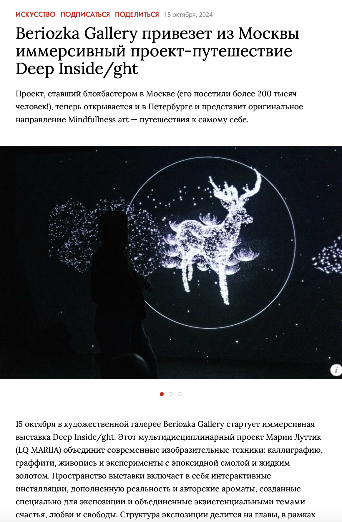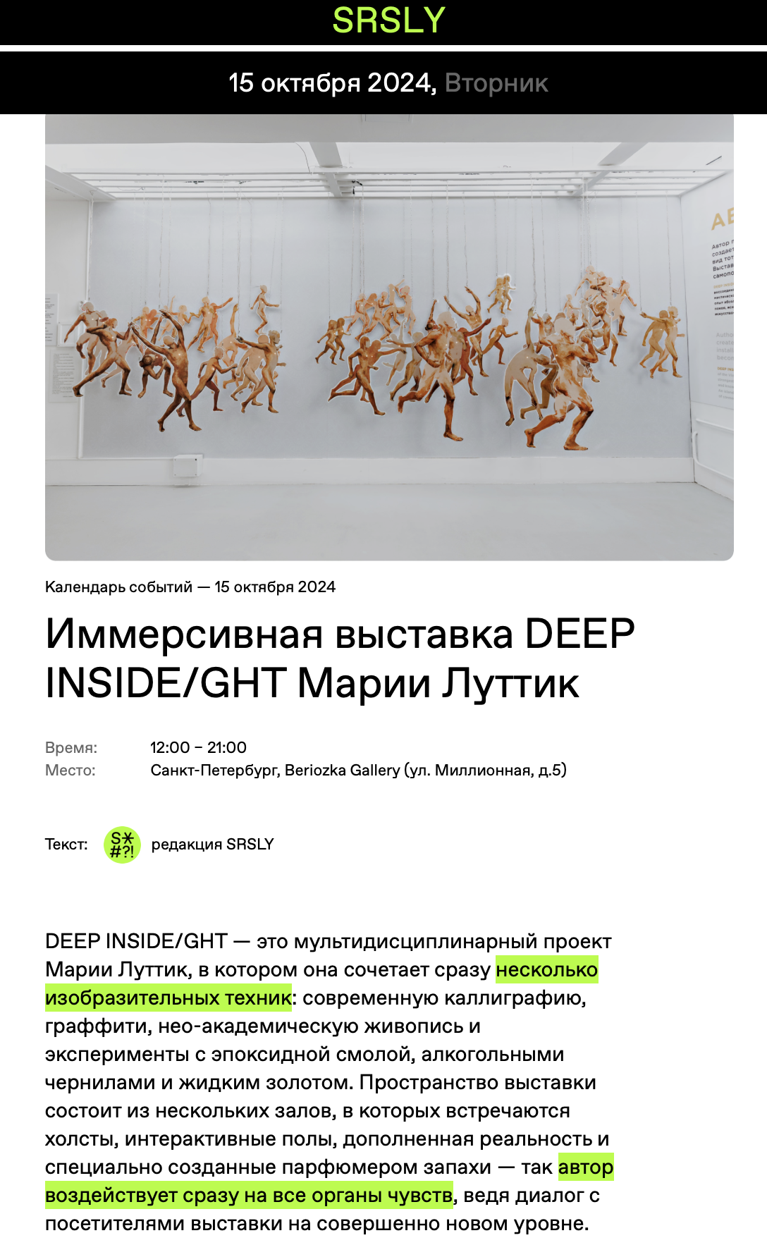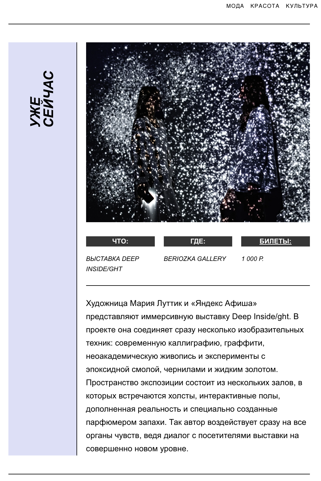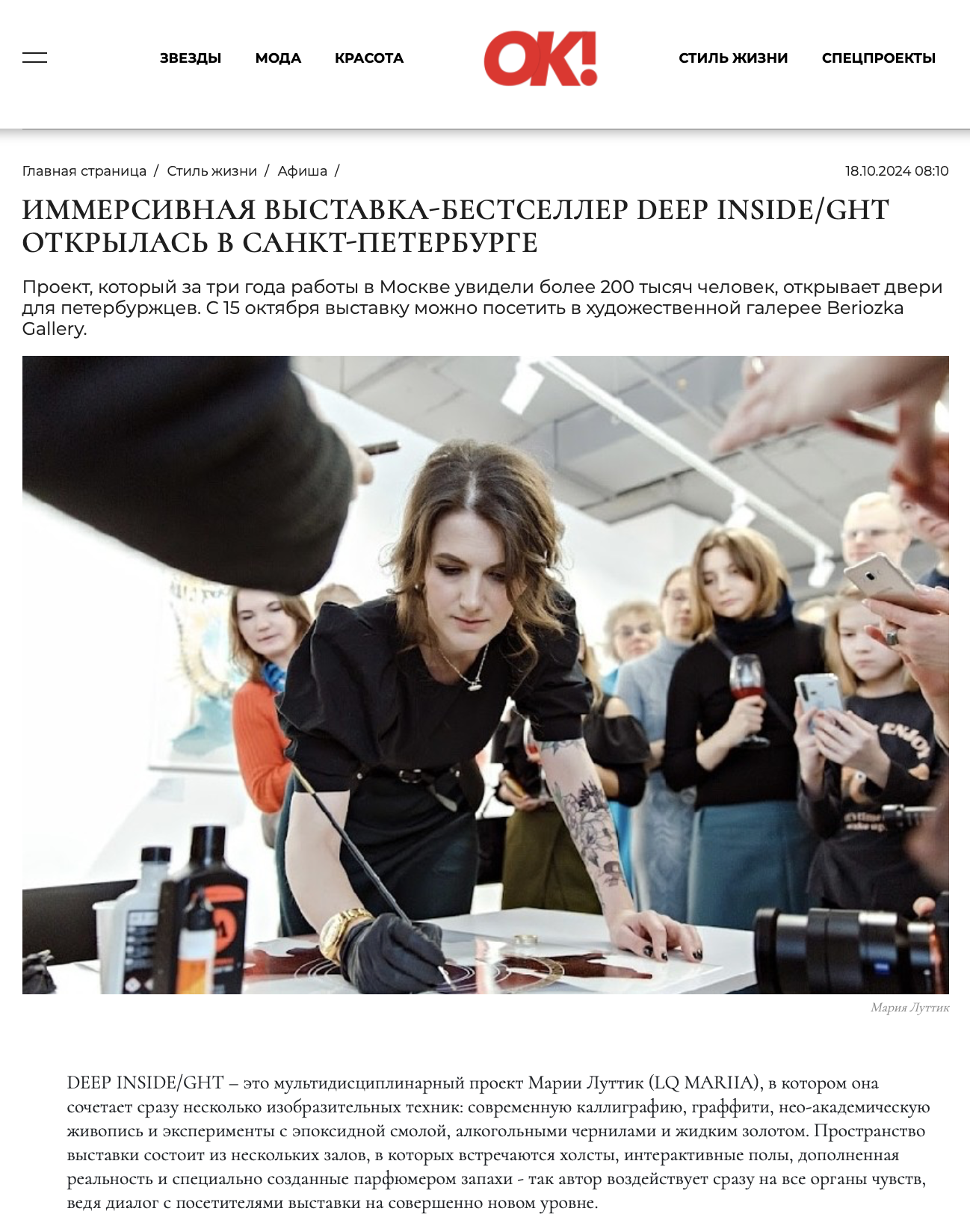 ОписаниеDEEP INSIDE/GHT – это мультидисциплинарный проект Марии Луттик (LQ MARIIA), в котором она сочетает сразу несколько изобразительных техник: современную каллиграфию, нео-академическую живопись и эксперименты с эпоксидной смолой, алкогольными чернилами и жидким золотом. Пространство выставки состоит из нескольких залов, в которых встречаются холсты, интерактивные полы, дополненная реальность и специально созданные парфюмером запахи - так автор воздействует сразу на все органы чувств, ведя диалог с посетителями выставки на совершенно новом уровне.