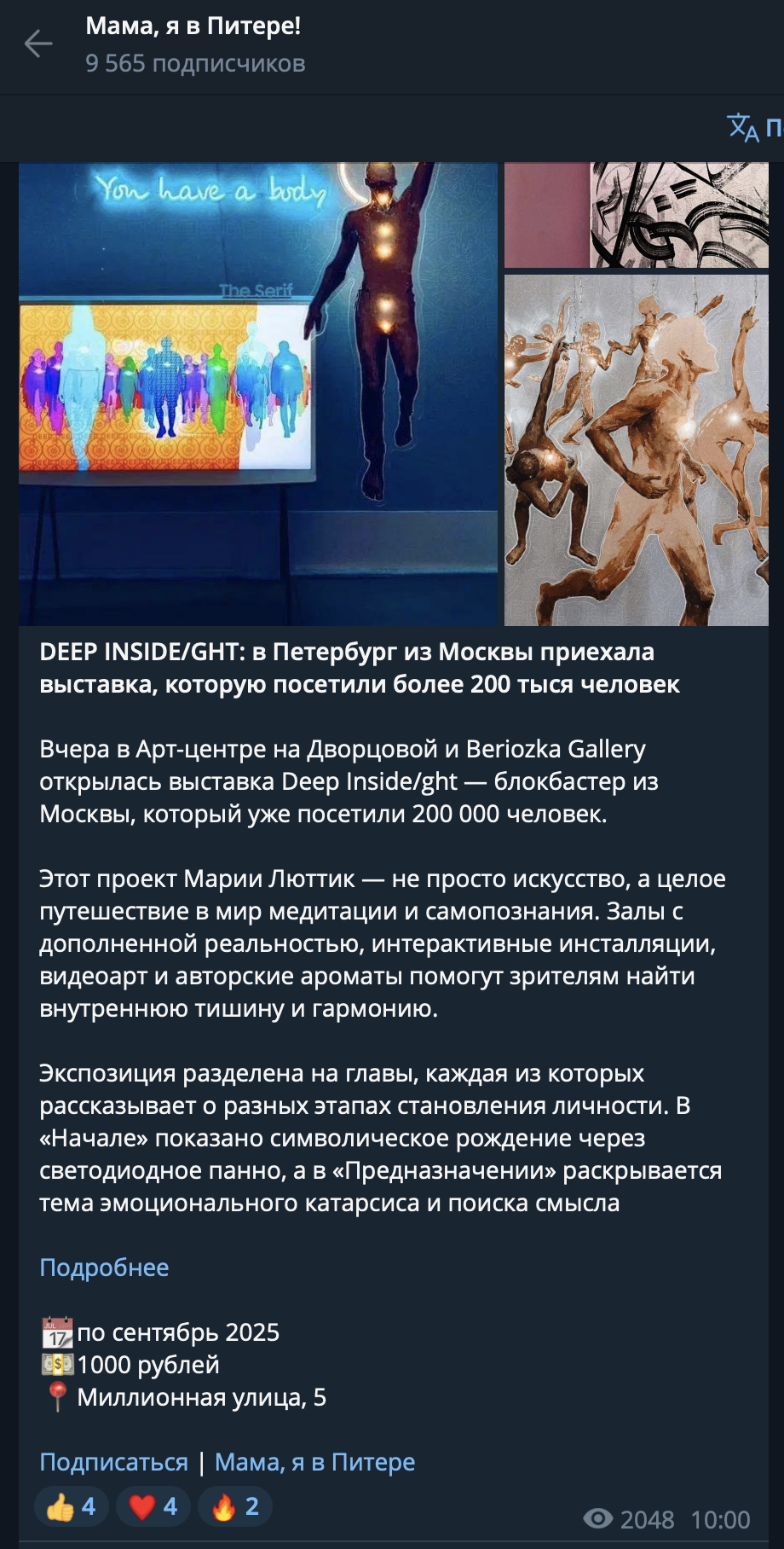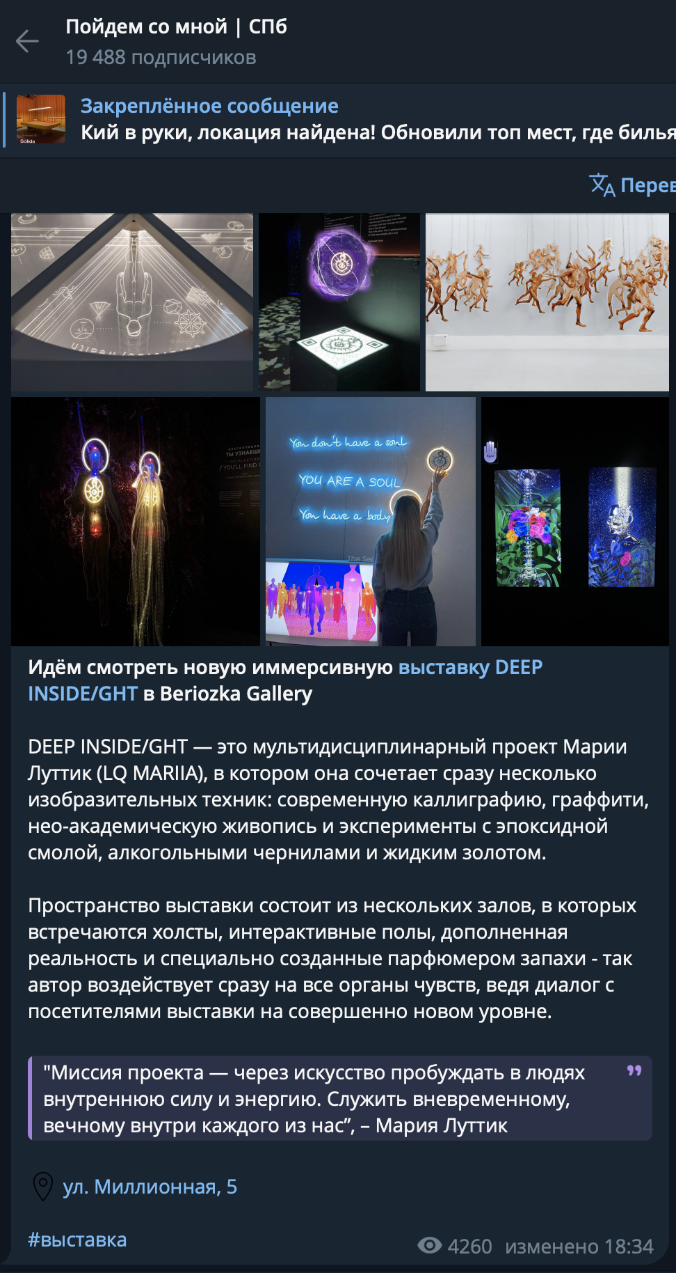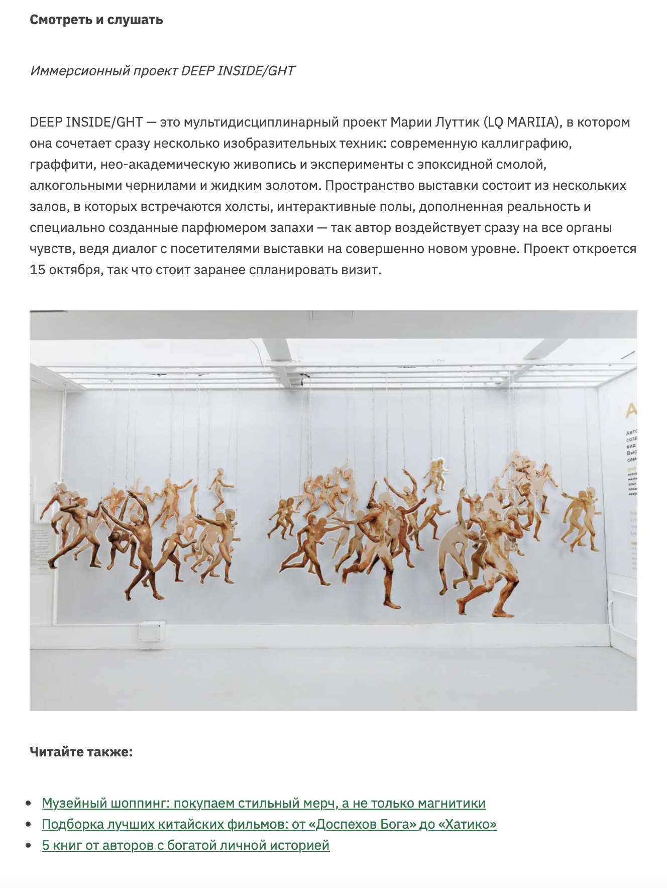 ОписаниеDEEP INSIDE/GHT – это мультидисциплинарный проект Марии Луттик (LQ MARIIA), в котором она сочетает сразу несколько изобразительных техник: современную каллиграфию, нео-академическую живопись и эксперименты с эпоксидной смолой, алкогольными чернилами и жидким золотом. Пространство выставки состоит из нескольких залов, в которых встречаются холсты, интерактивные полы, дополненная реальность и специально созданные парфюмером запахи - так автор воздействует сразу на все органы чувств, ведя диалог с посетителями выставки на совершенно новом уровне.