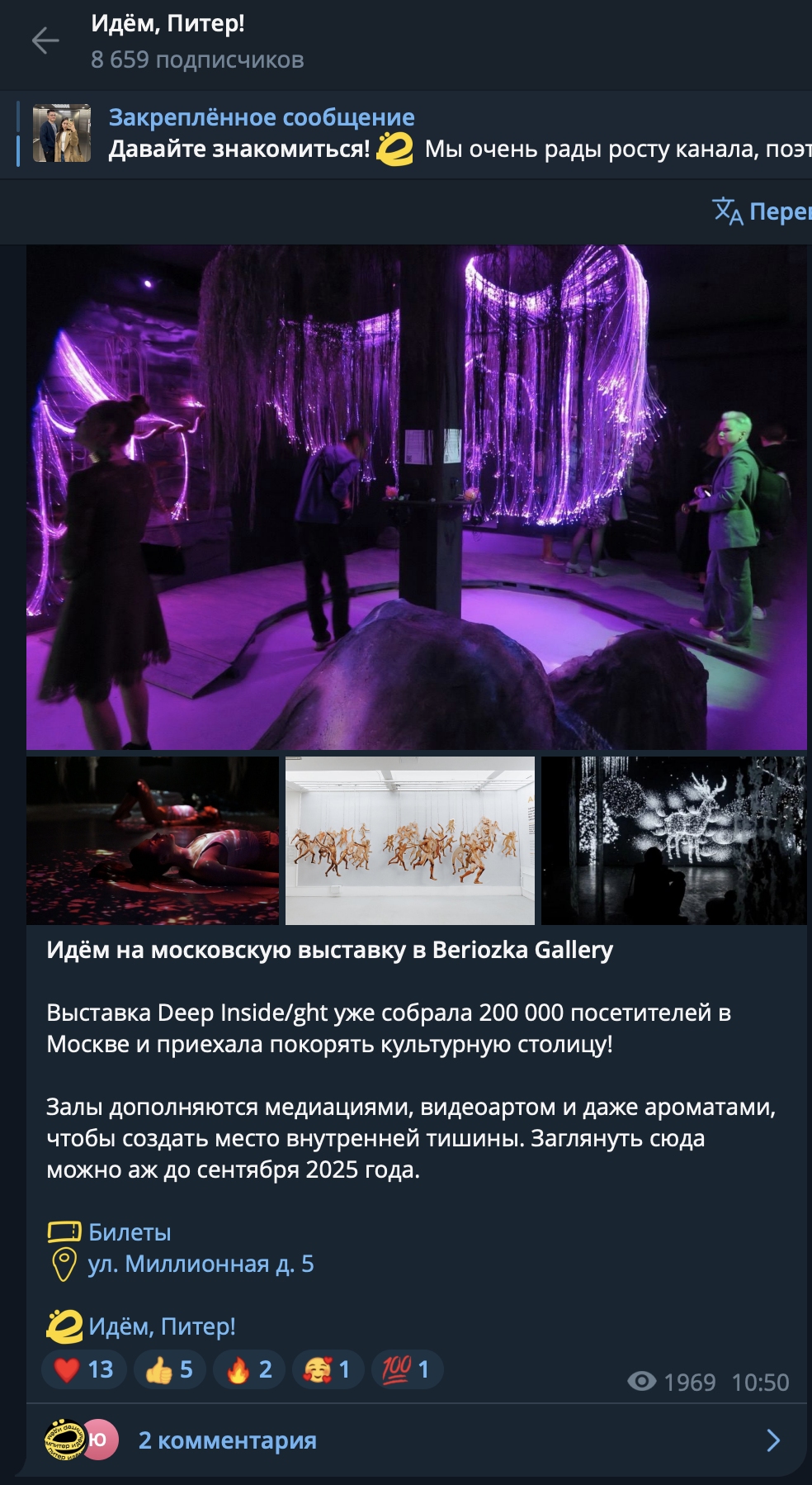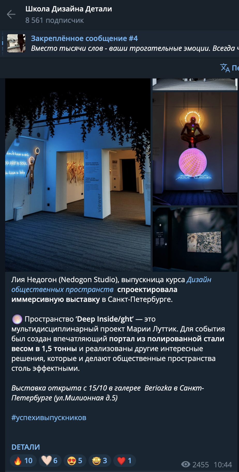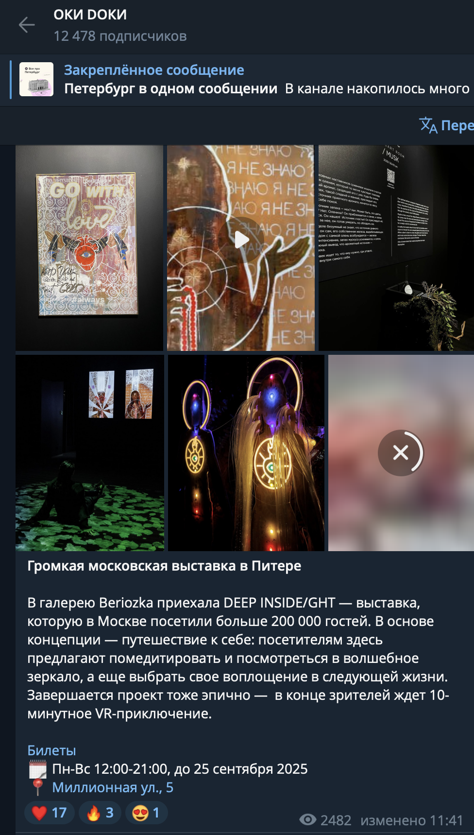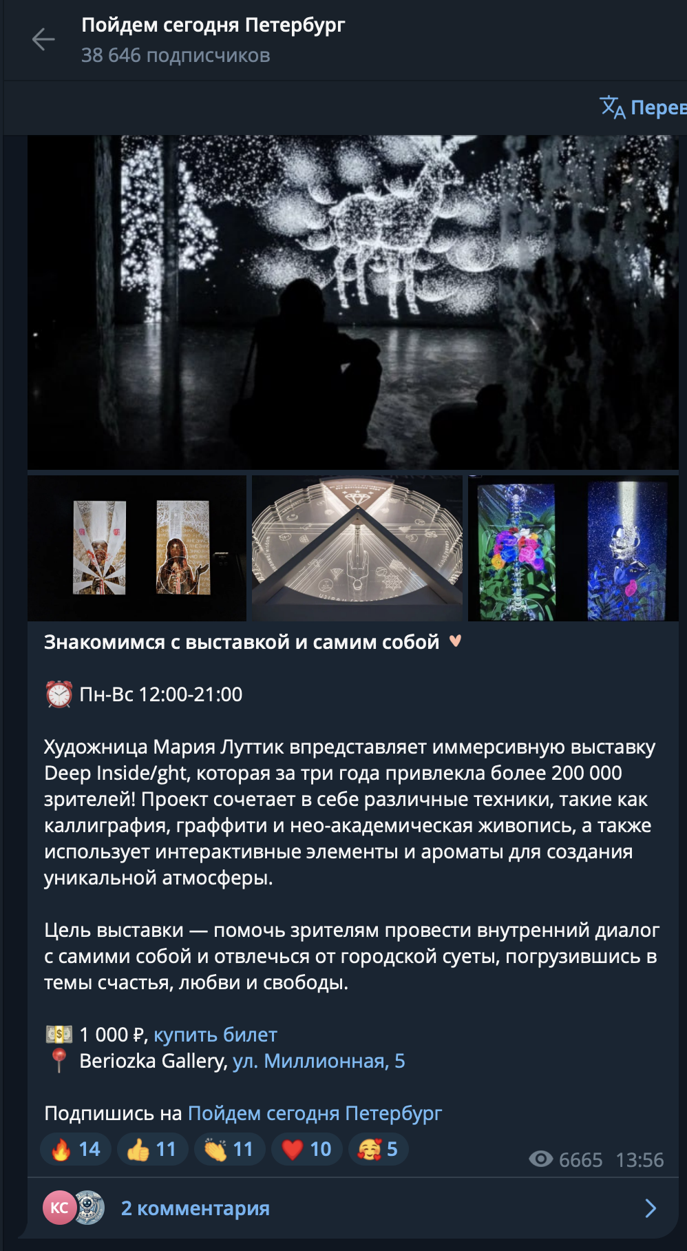 ОписаниеDEEP INSIDE/GHT – это мультидисциплинарный проект Марии Луттик (LQ MARIIA), в котором она сочетает сразу несколько изобразительных техник: современную каллиграфию, нео-академическую живопись и эксперименты с эпоксидной смолой, алкогольными чернилами и жидким золотом. Пространство выставки состоит из нескольких залов, в которых встречаются холсты, интерактивные полы, дополненная реальность и специально созданные парфюмером запахи - так автор воздействует сразу на все органы чувств, ведя диалог с посетителями выставки на совершенно новом уровне.